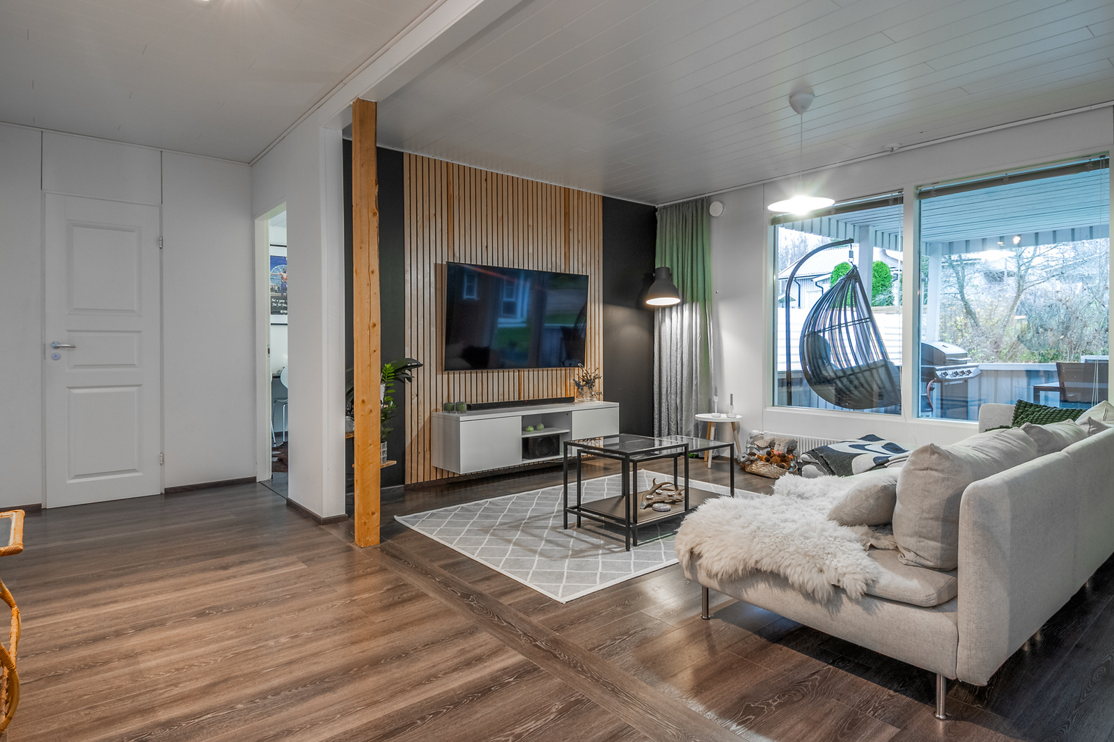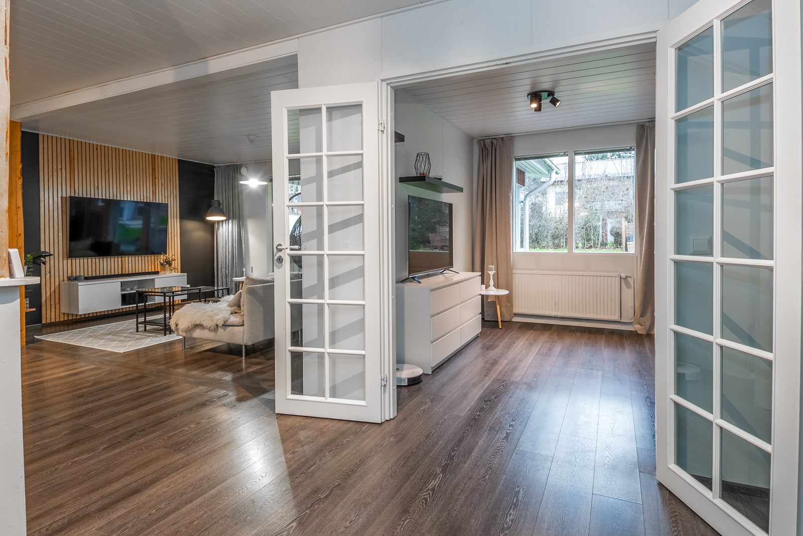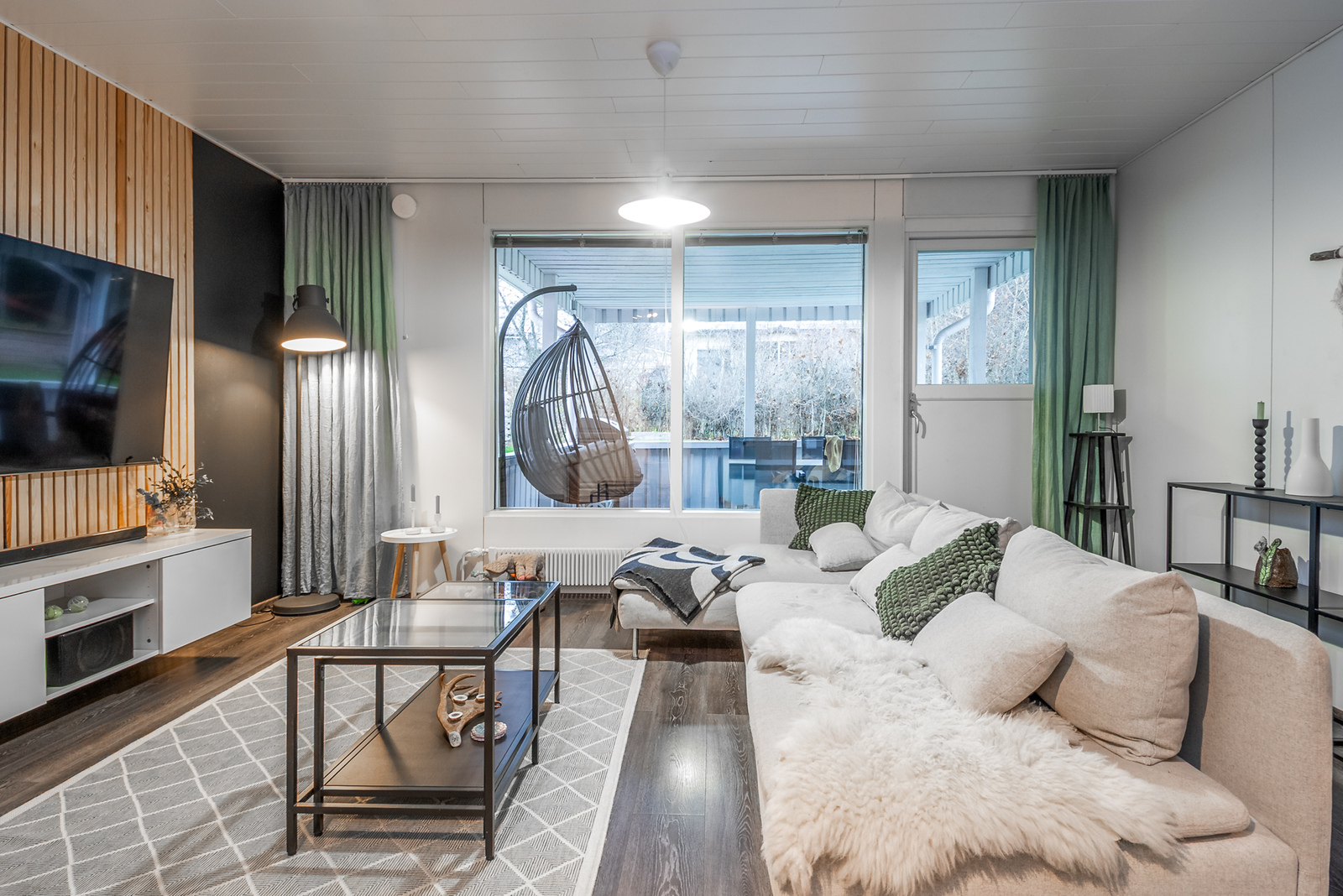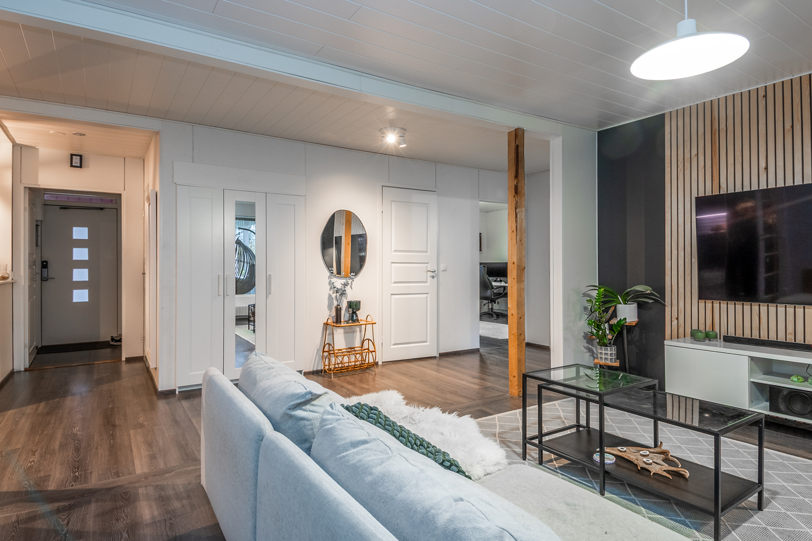 Olohuoneen kuvausseinämateriaali: maalattu. Lattia: laminaatti