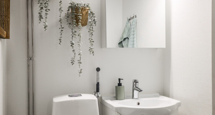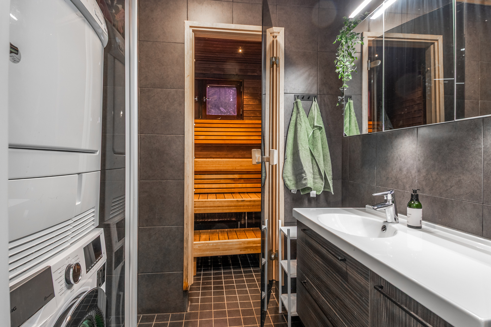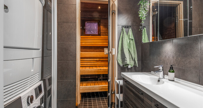 Kylpyhuone ja sauna ovat myös remontoidut ja lisäksi tästä kodista löytyy myös erillinen wc.