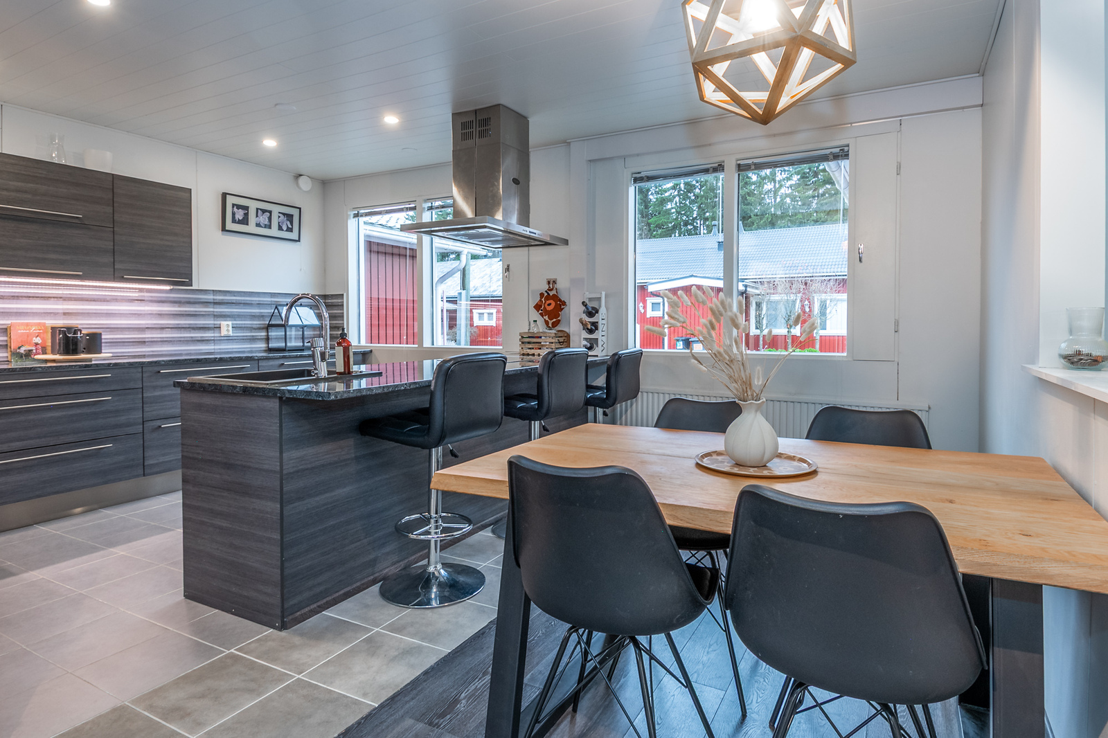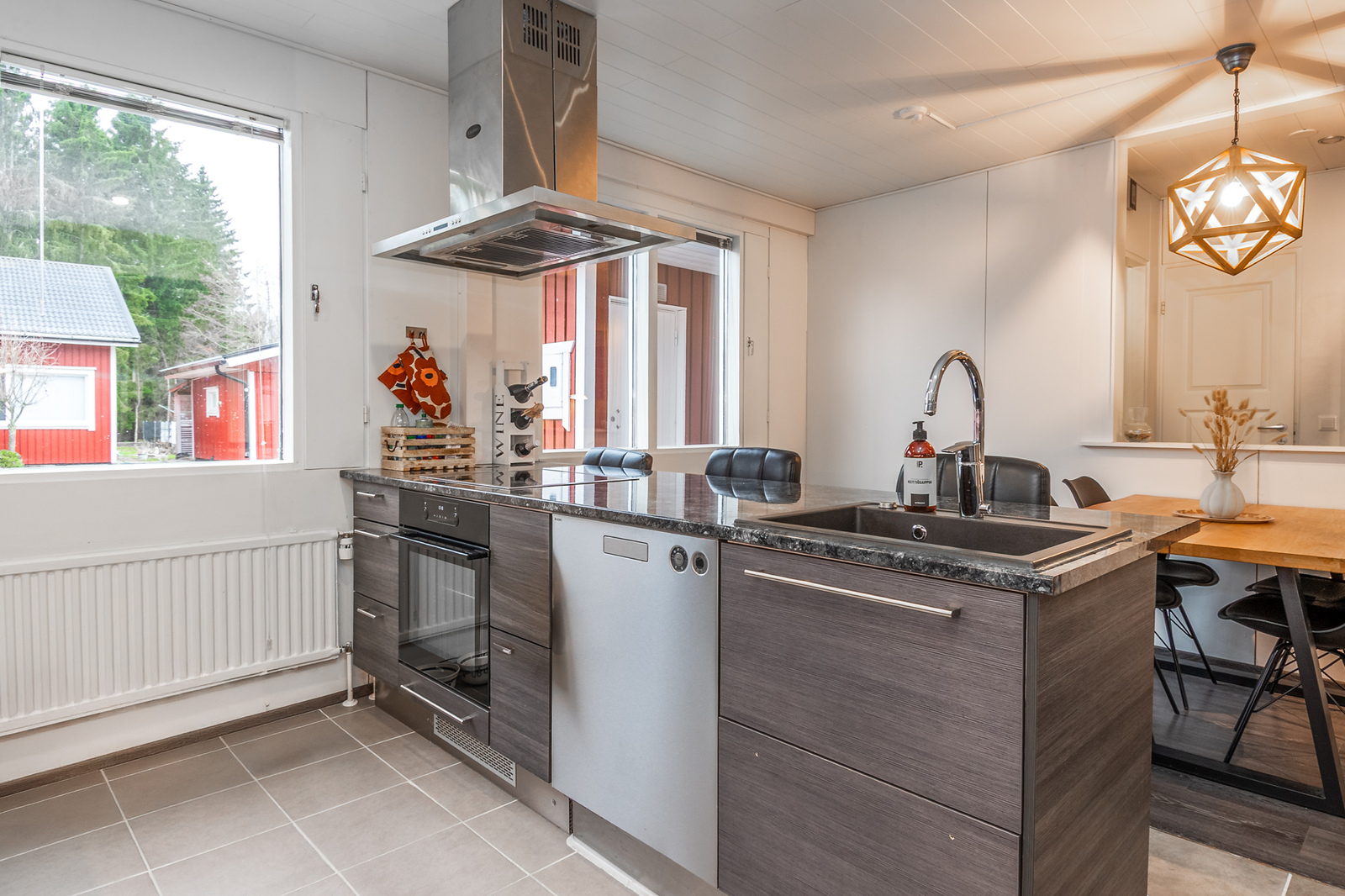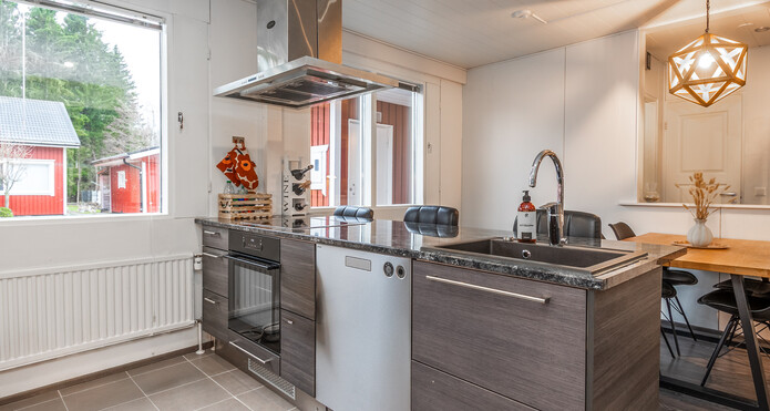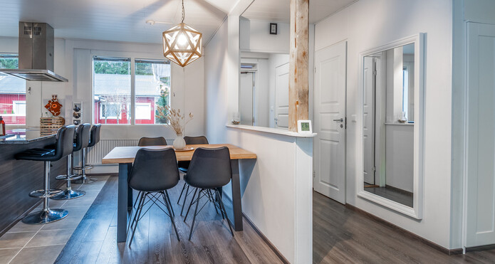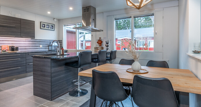 Tyylikäs skandikeittiö rajautuu ruokailutilasta saarekkeella, jossa on vesipiste. Ruokailutilaan mahtuu suurempikin ruokapöytä.