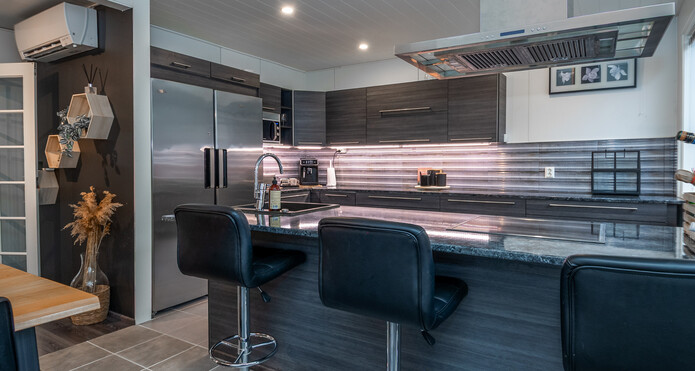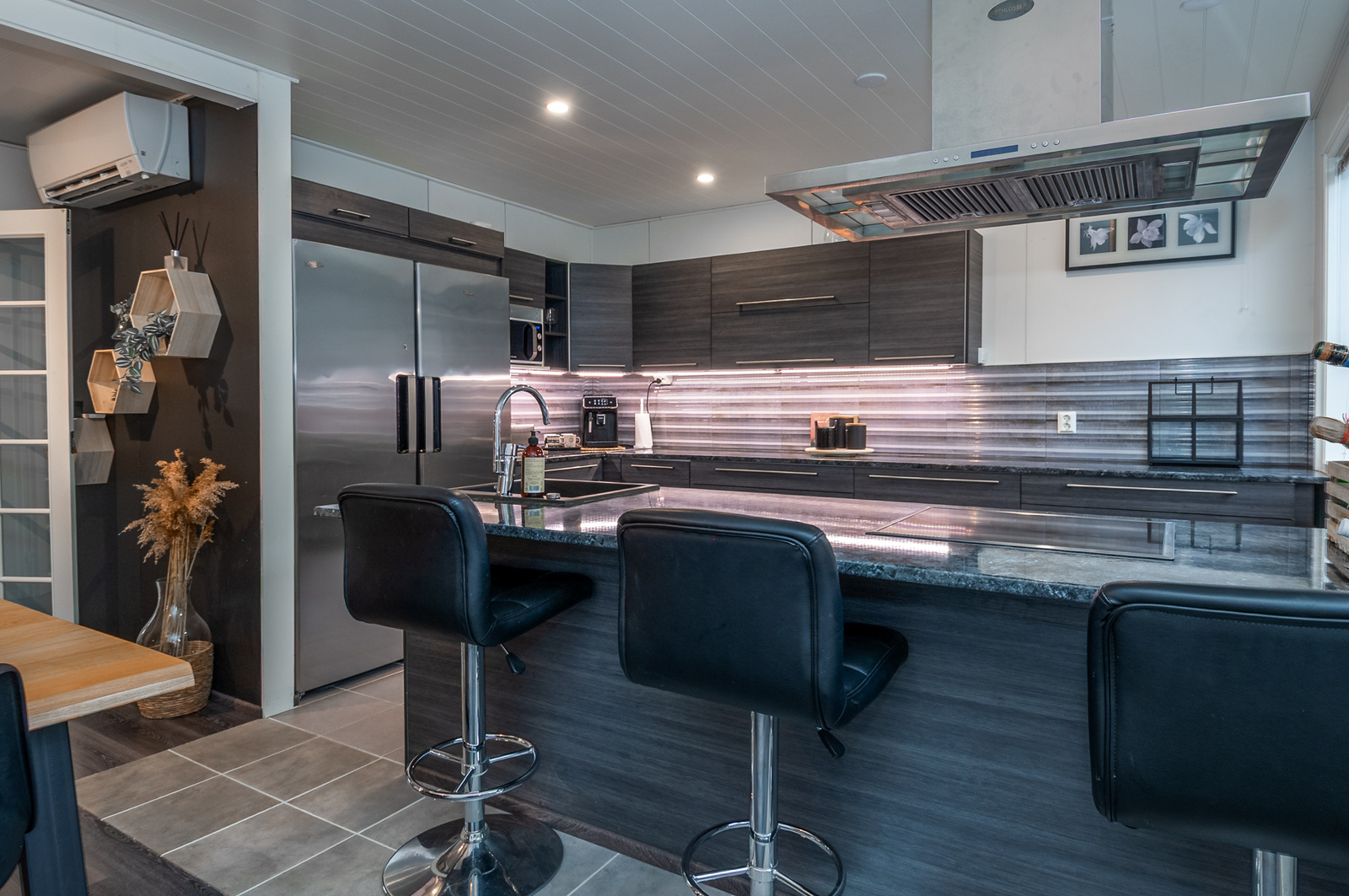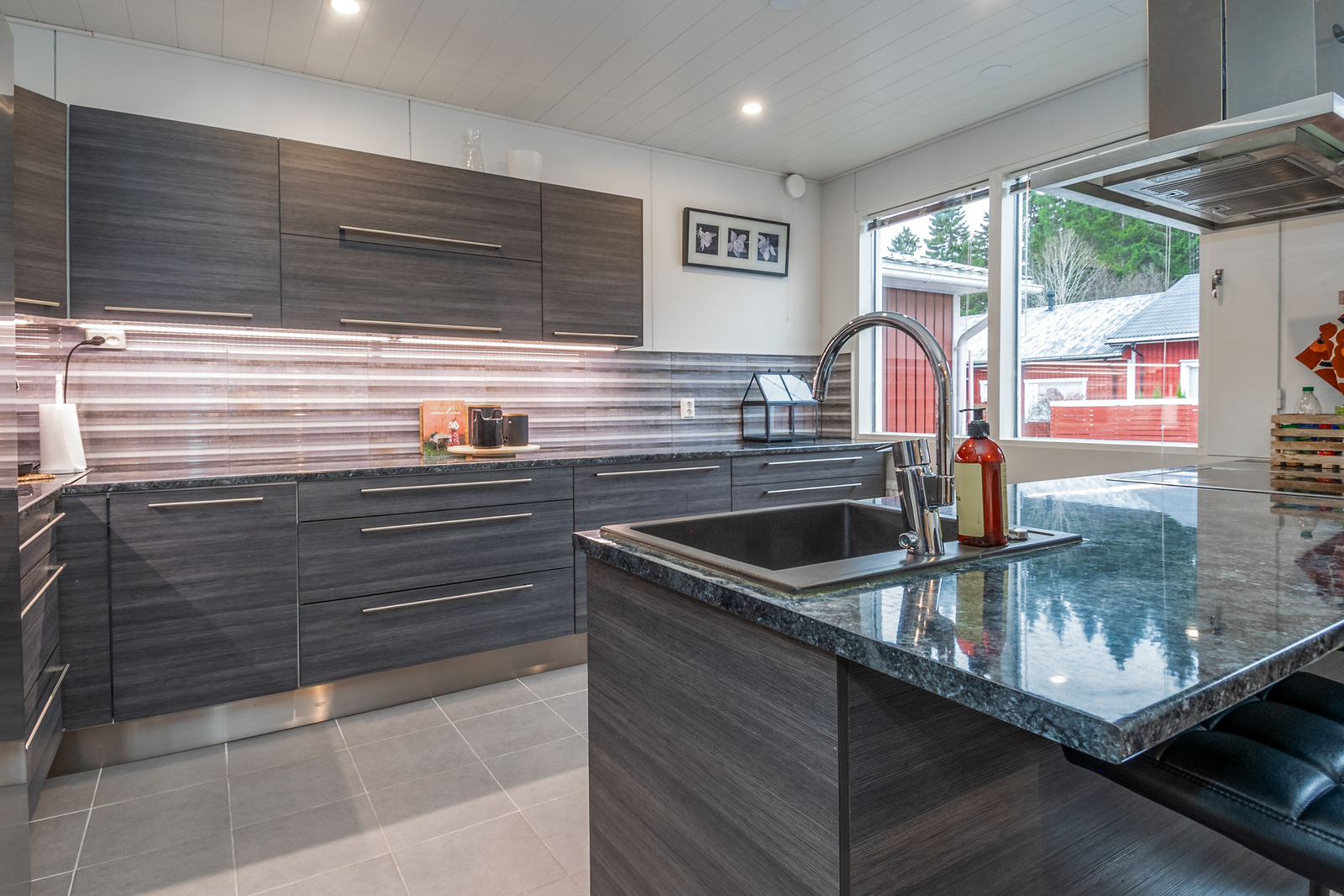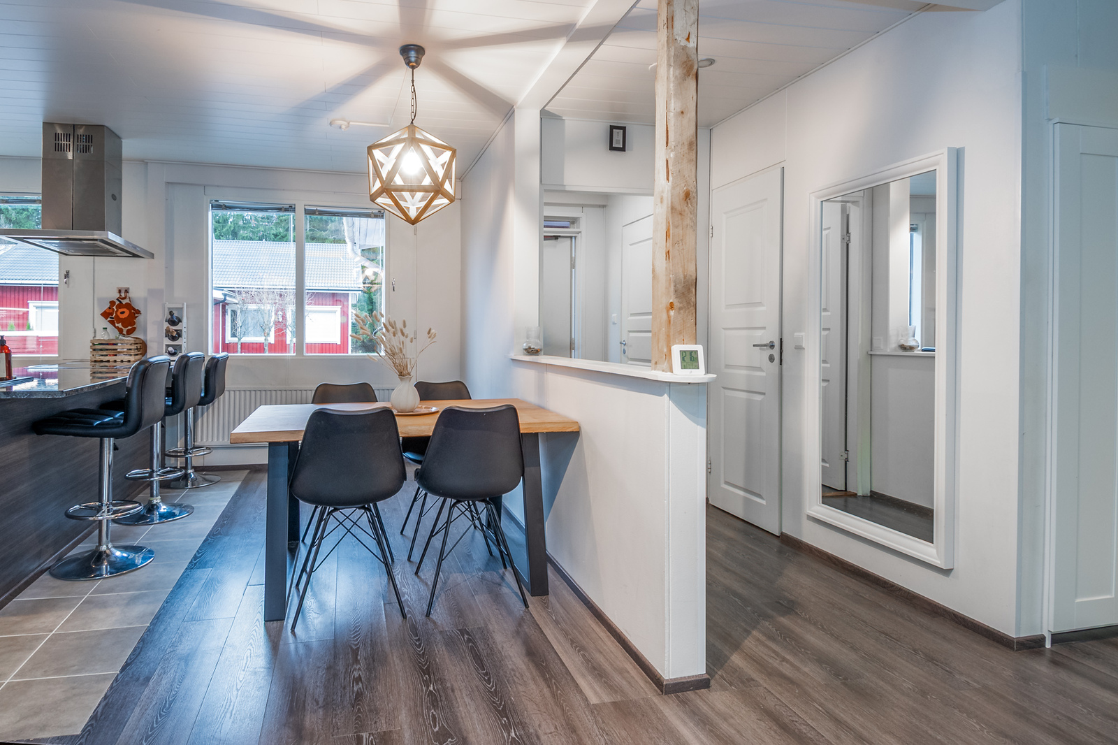 Tyylikäs skandikeittiö rajautuu ruokailutilasta saarekkeella, jossa on vesipiste. Ruokailutilaan mahtuu suurempikin ruokapöytä.