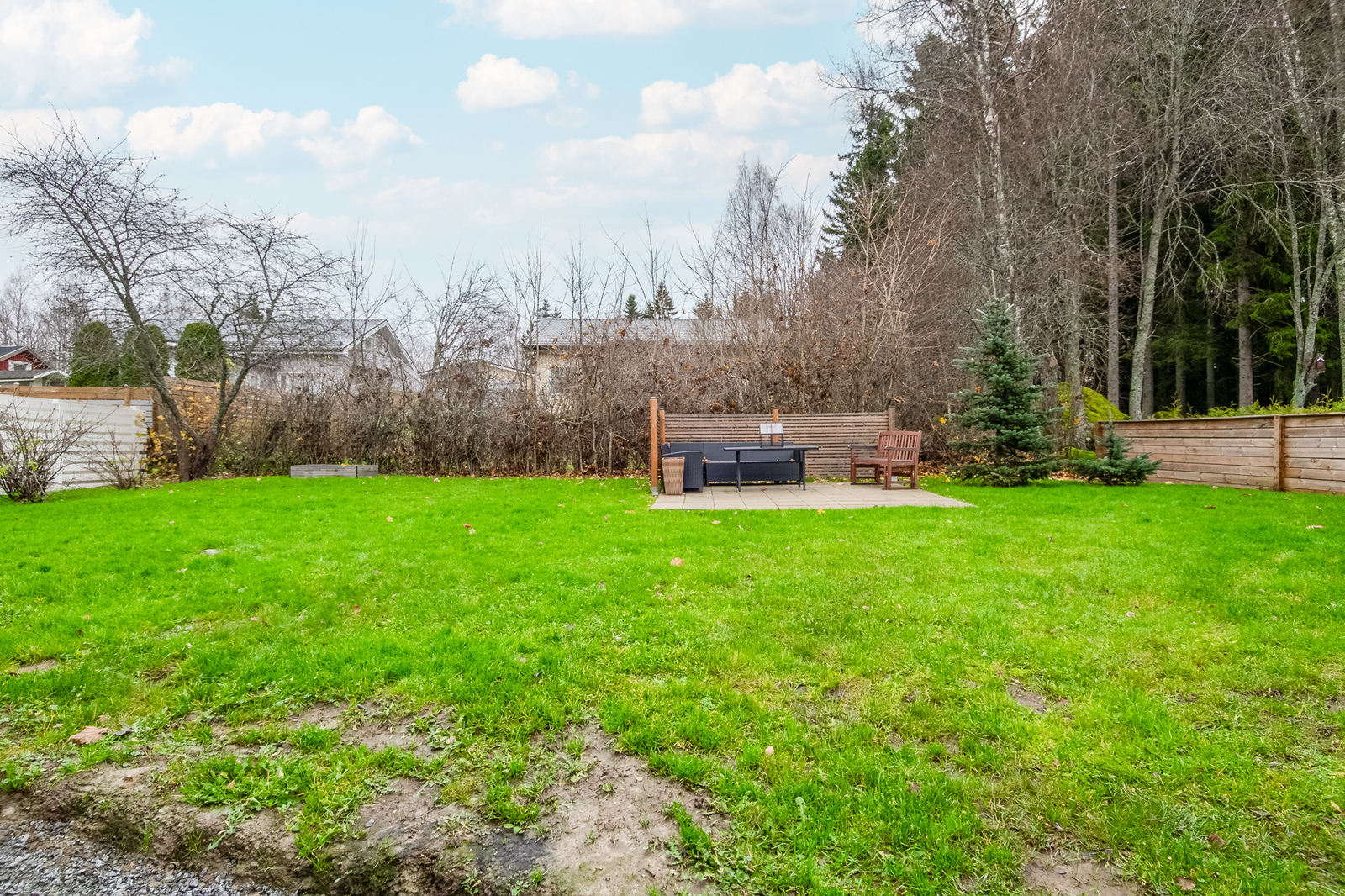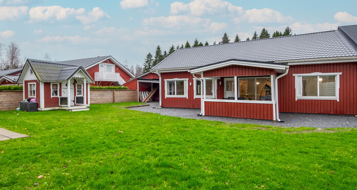 Detta enplanshus befinner sig på en av områdets största tomter och den välskötta gräsmattan på gårdsplanen erbjuder gott om plats för barnens lekar och trevlig utevistelse.