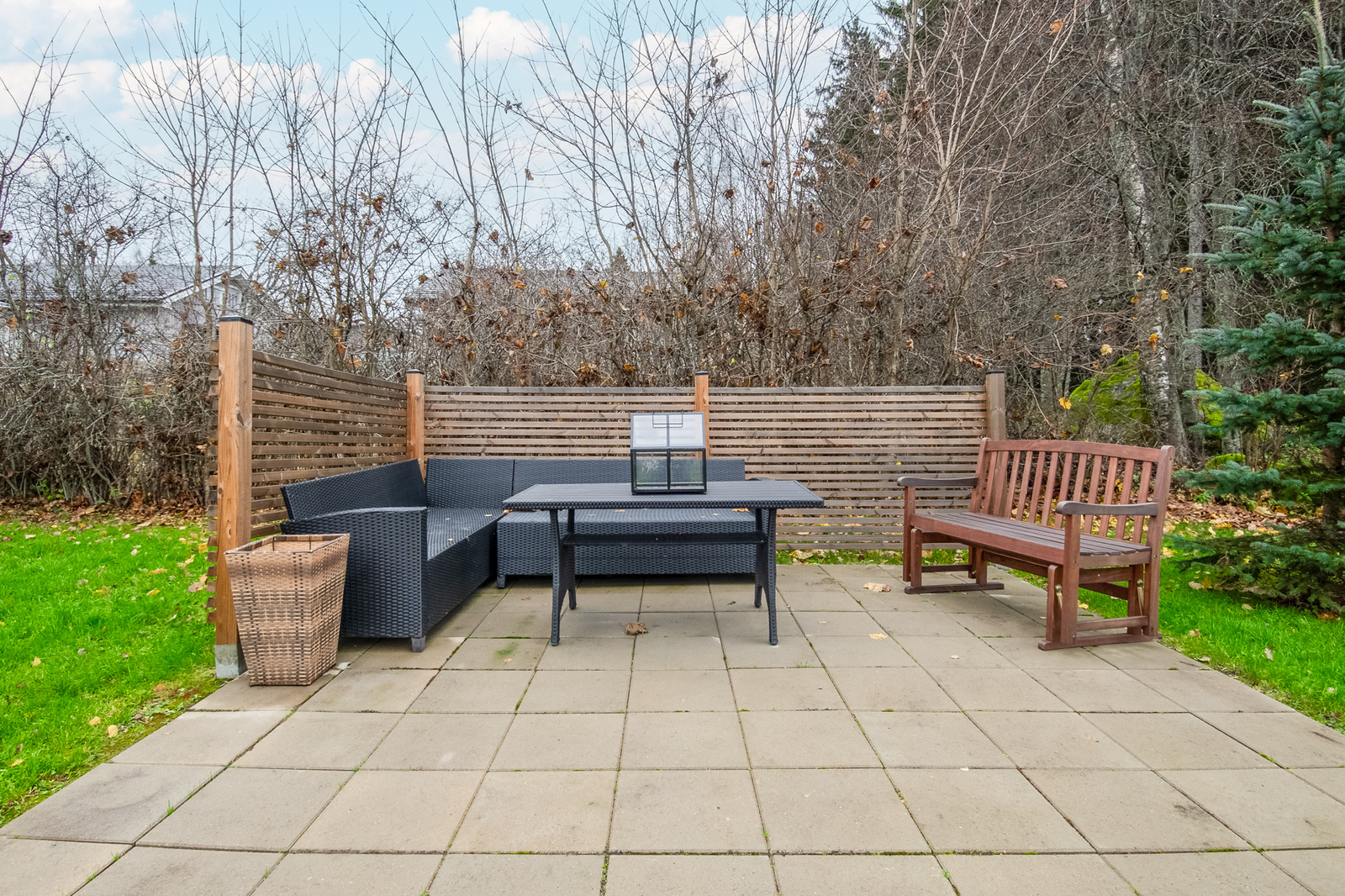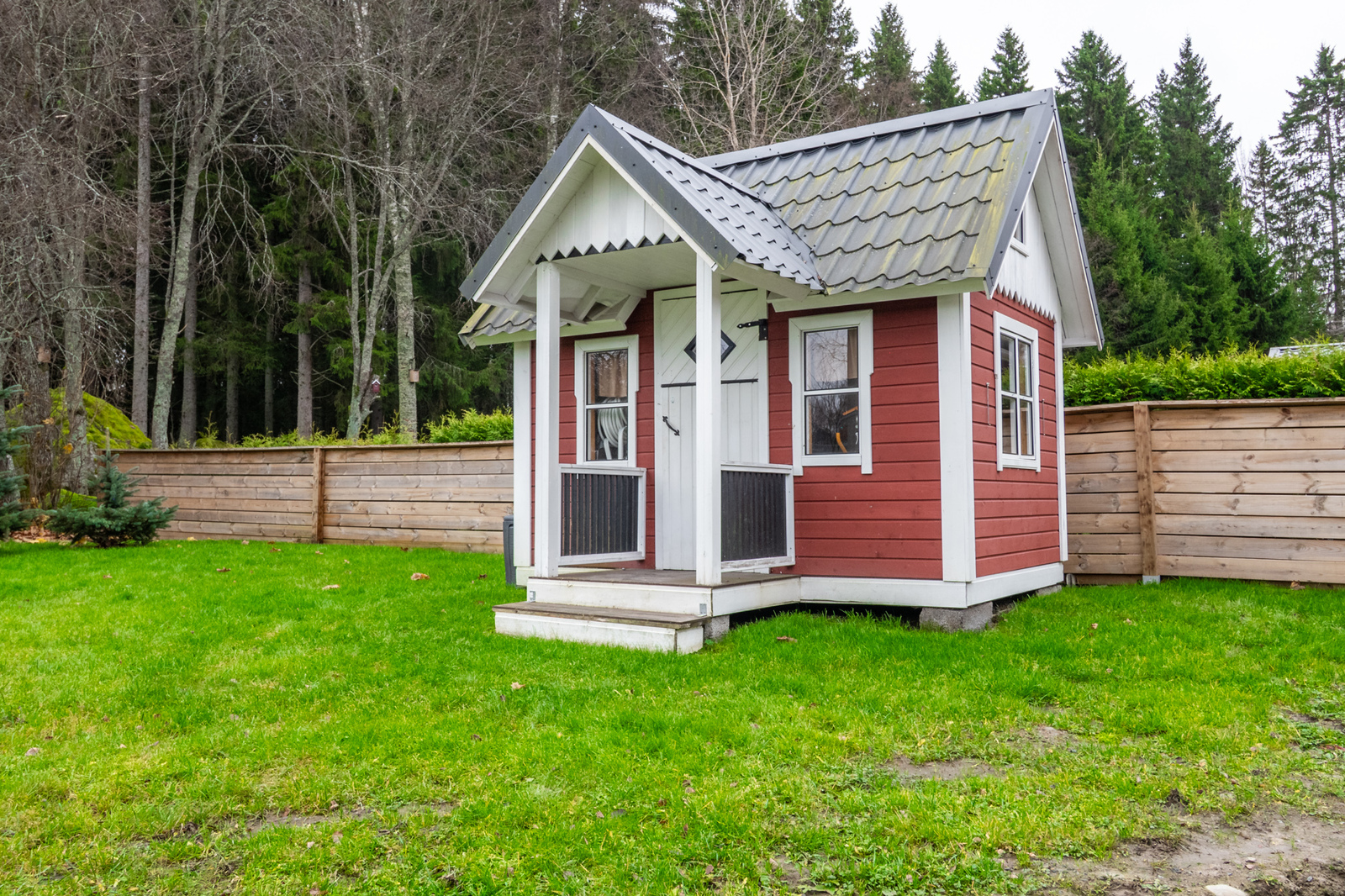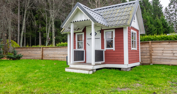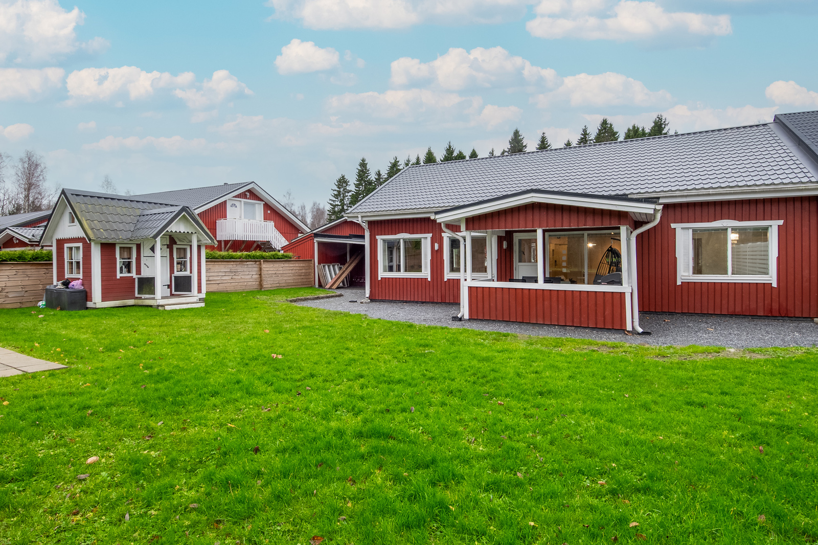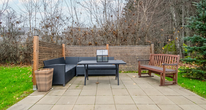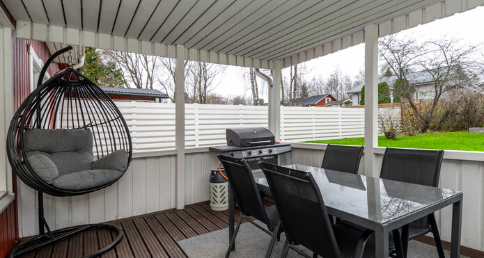 Tomten är trivsam och på baksidan finns både en täckt och en öppen solterrass. På gården står även en charmig, rymlig lekstuga - till glädje för både barn och vuxna tack vare sin mångsidighet.