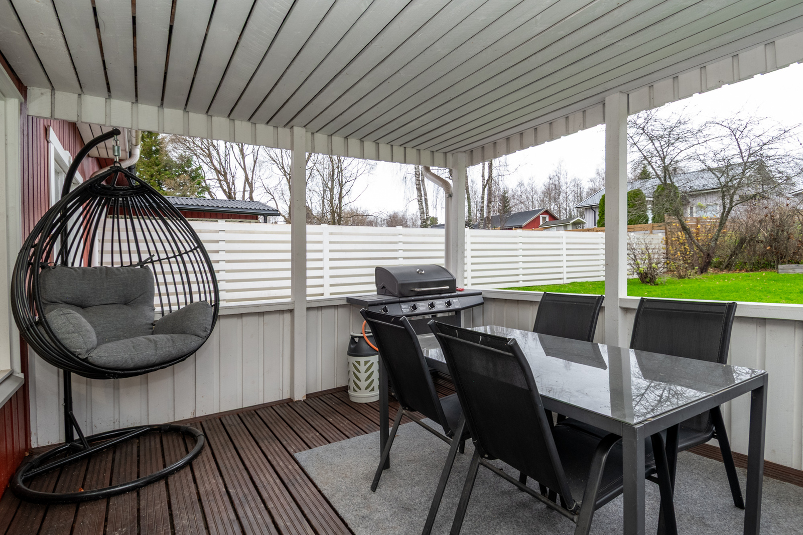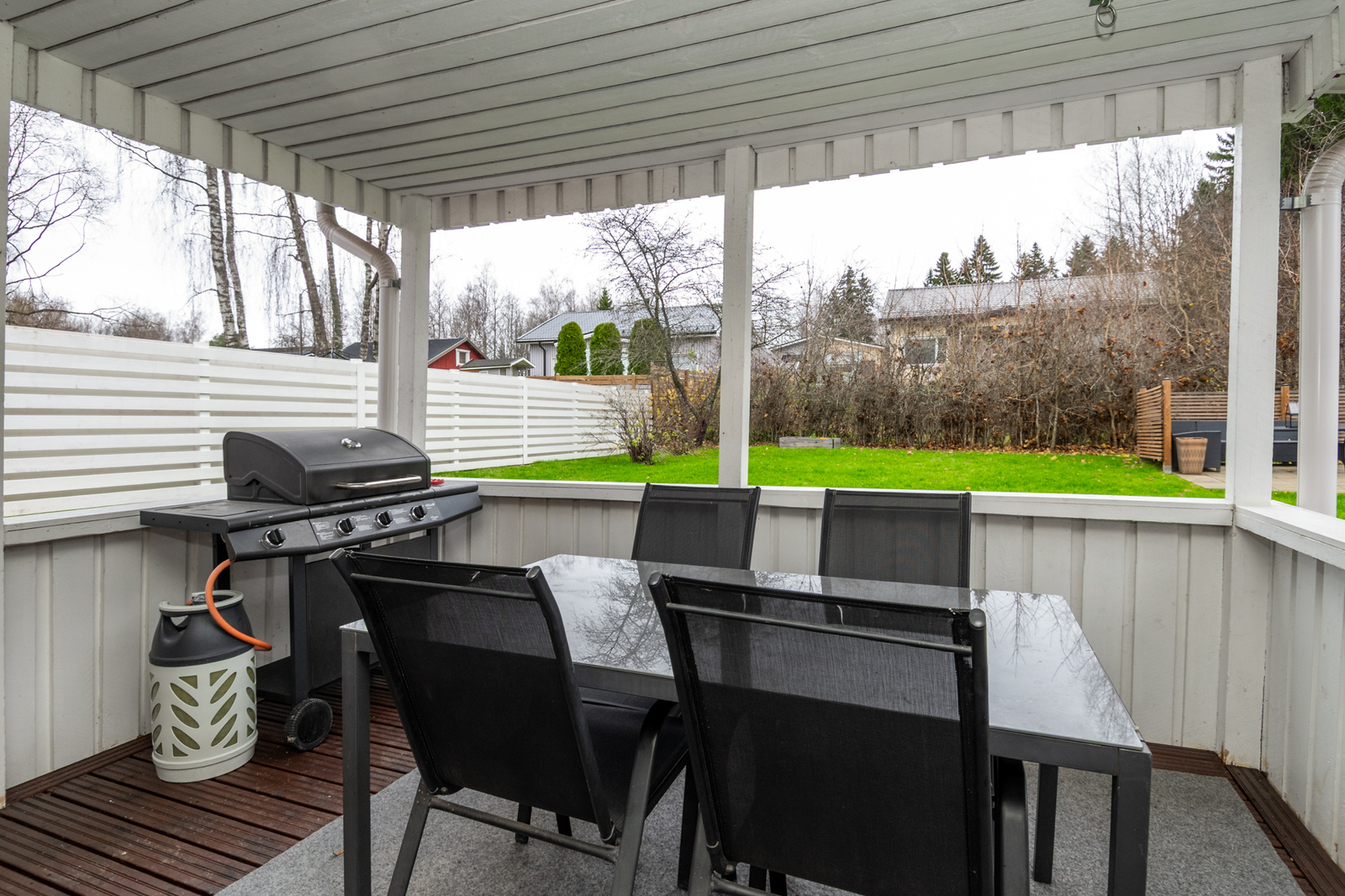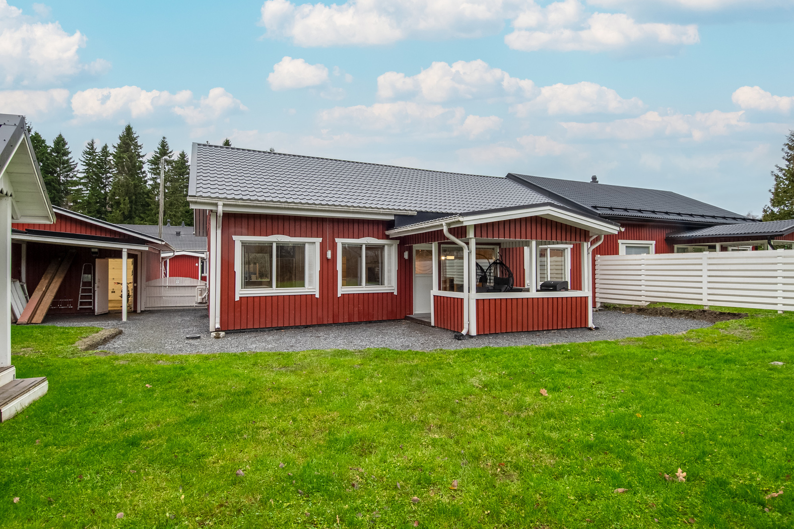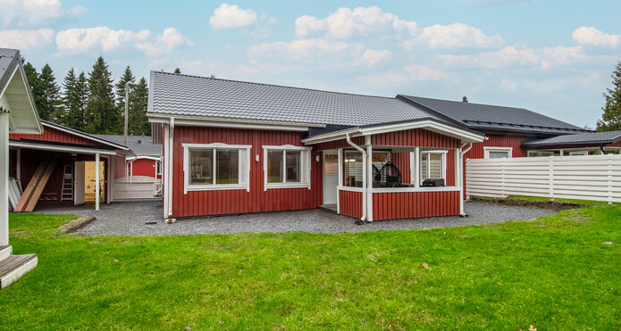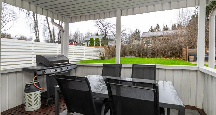 Piha-alueet ovat viihtyisät ja takapihalta löytyy niin katettua kuin kattamaton aurinkoterassi. Pihassa on myös idyllinen ja tilava leikkimökki lasten ja miksei monikäyttöisyydessään vanhempienkin iloksi.