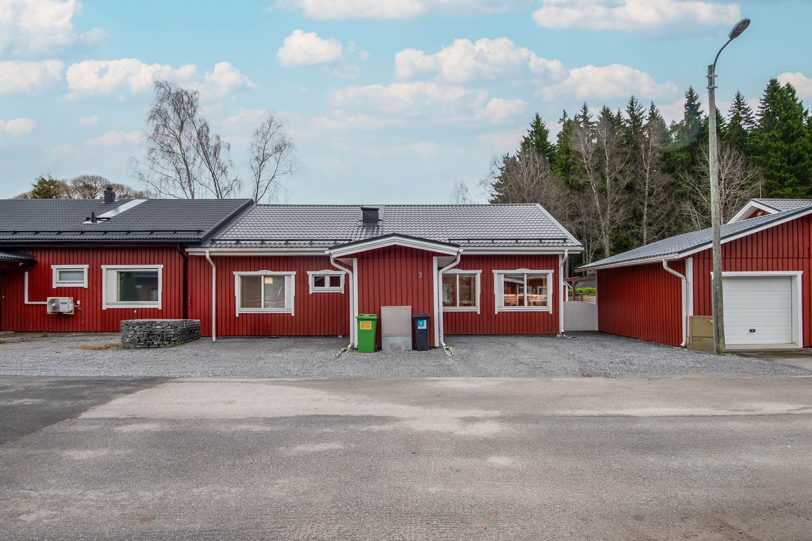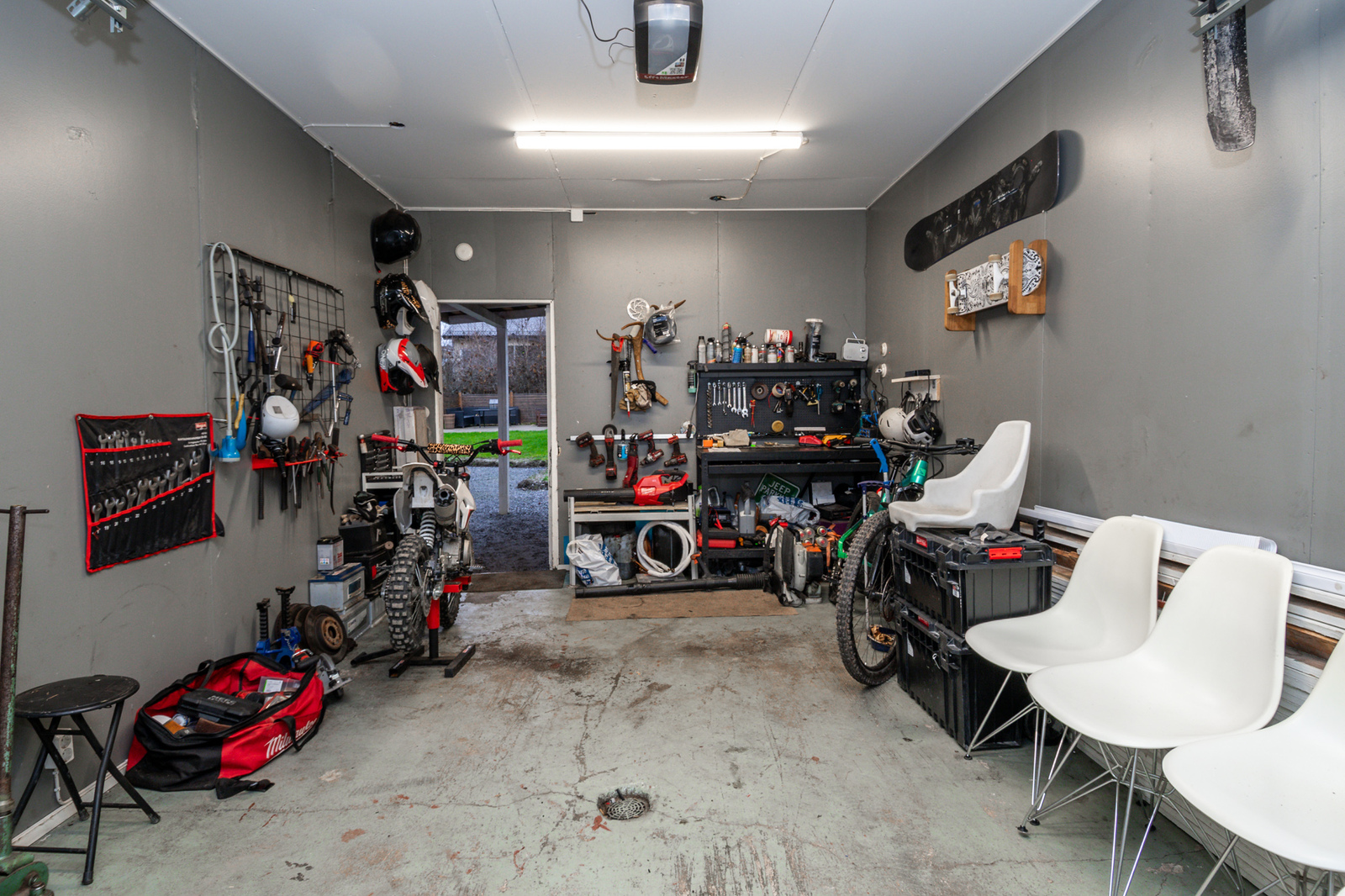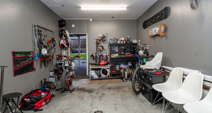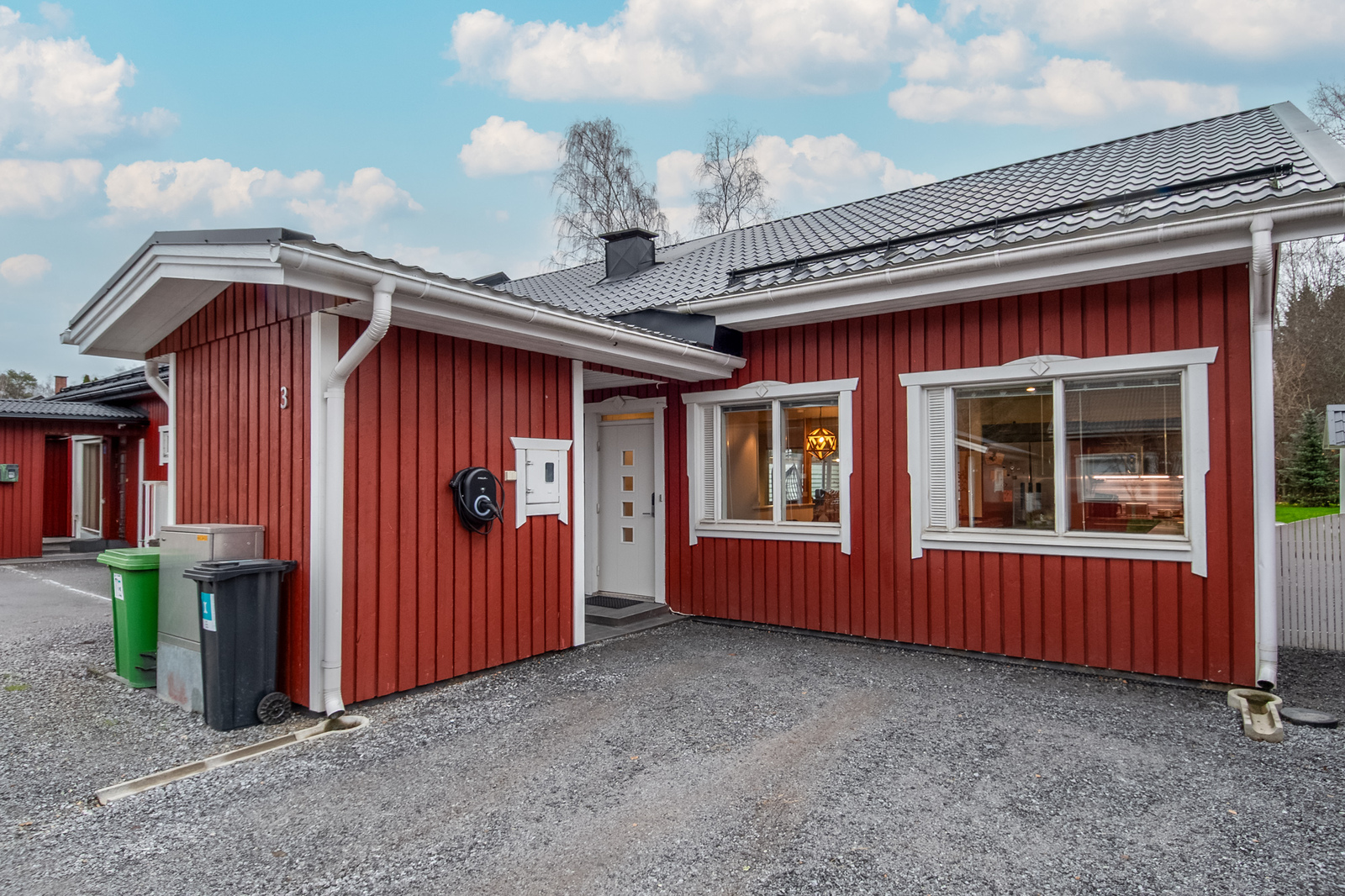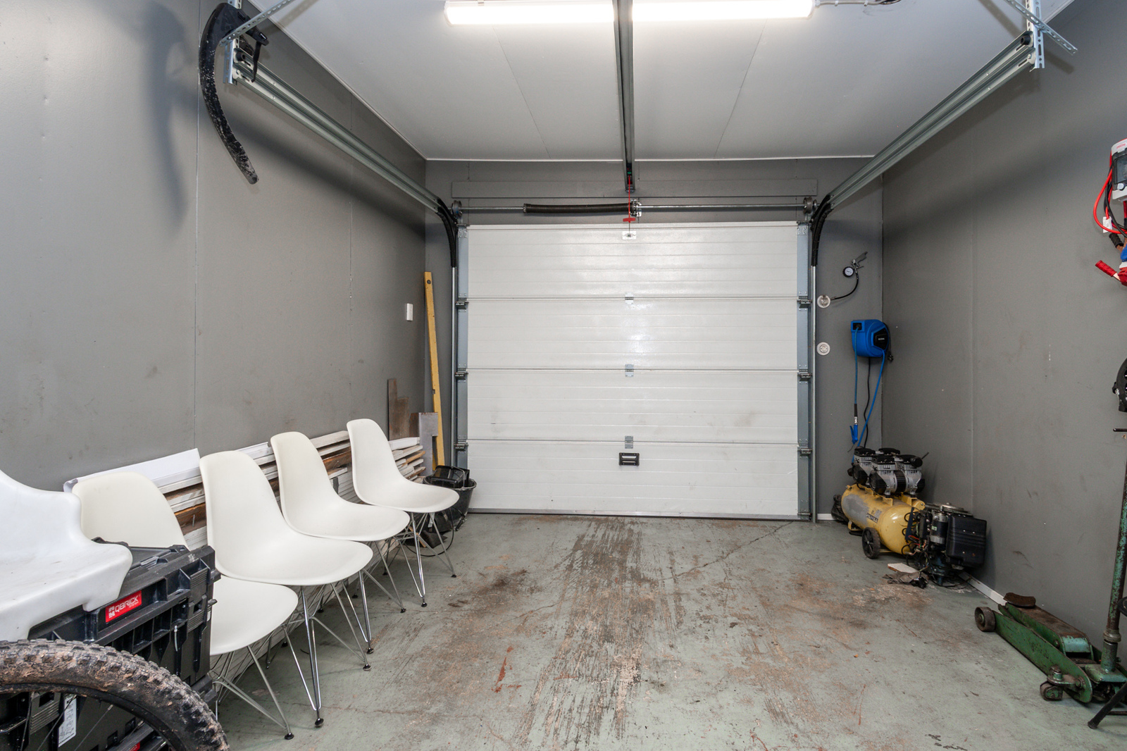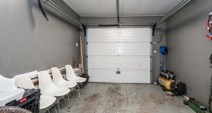 Garaget har en eldriven dörr och det finns laddmöjlighet för elbil.