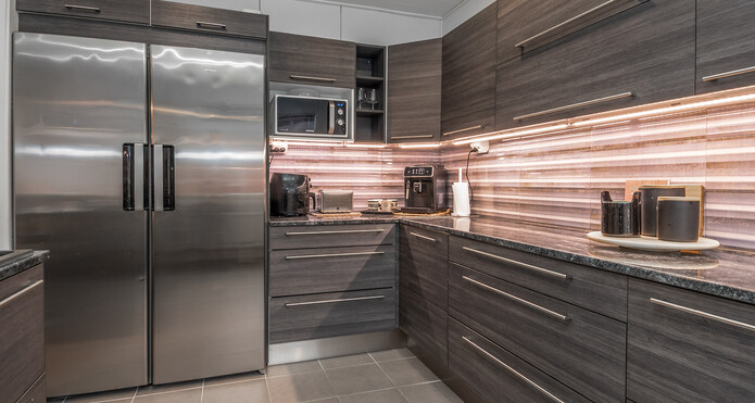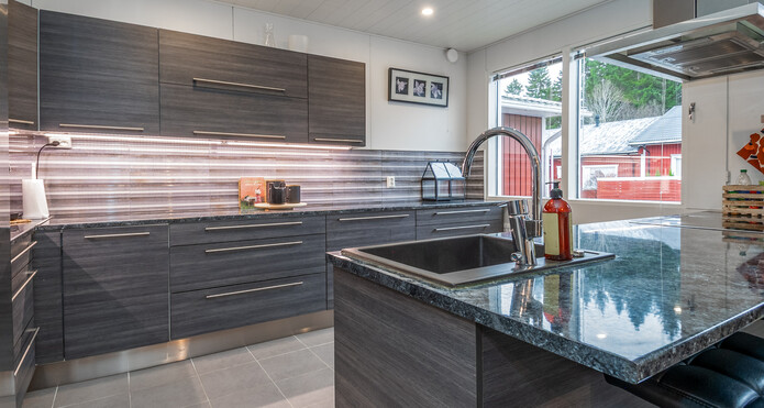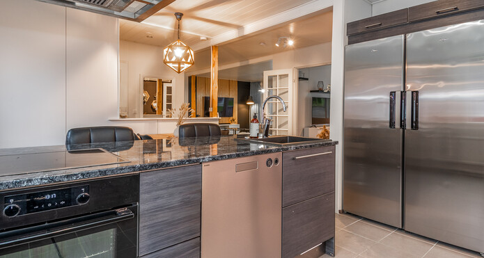 Det stilrena, skandinaviskt inspirerade köket avgränsas från matplatsen med en köksö med vattenanslutning. I matplatsen finns gott om utrymme för ett större matbord.