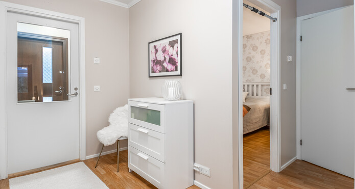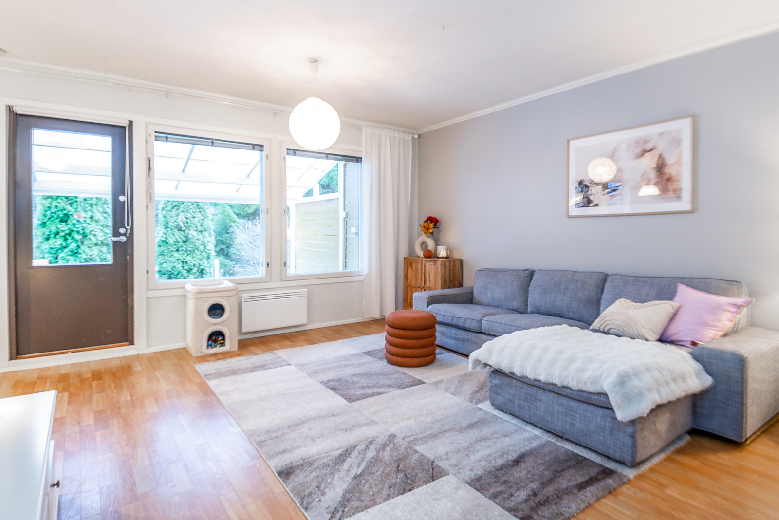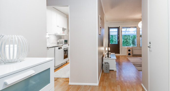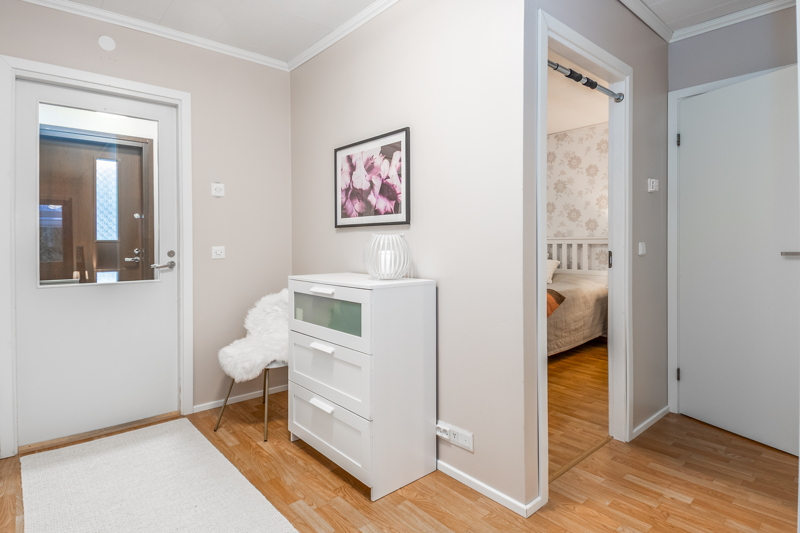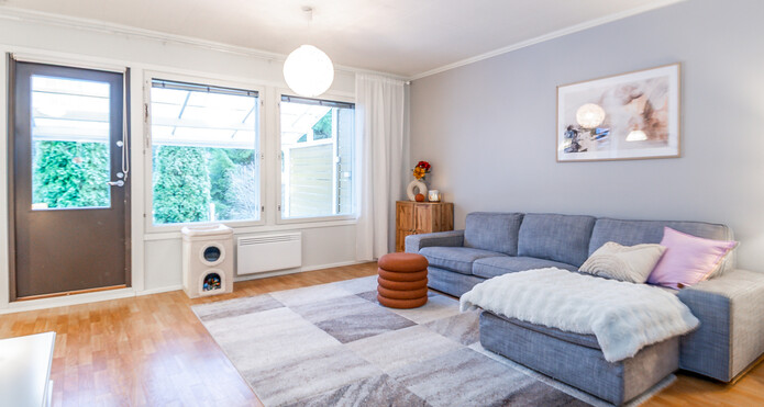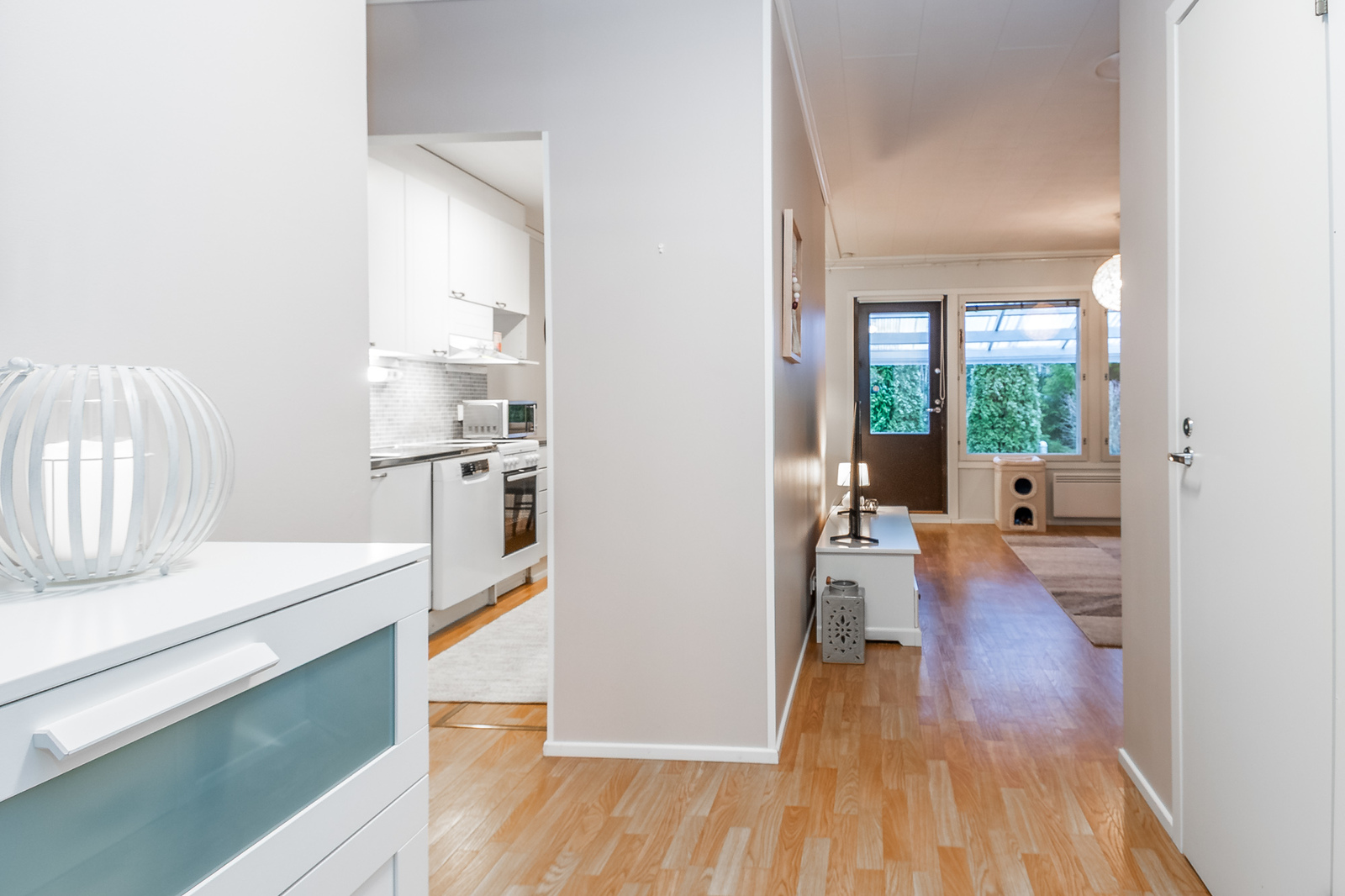 Tämä 80 asuinneliön koti on pohjaratkaisultaan erinomainen. Tilat ovat yhdessä kerroksessa ja jakautuvat tilavaan olohuoneeseen, osittain avoimeen keittiöön, kahteen hyvänkokoiseen makuuhuoneeseen ja juuri remontoituun kylpyhuoneeseen sekä omaan saunaan. Toisesta makuuhuoneesta löytyy myös vaatehuone.