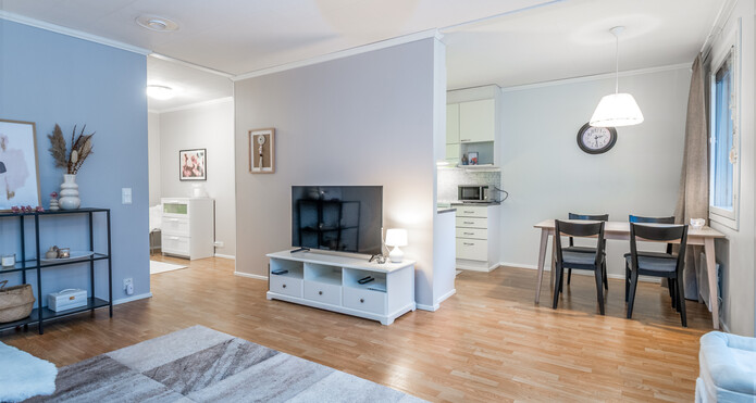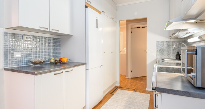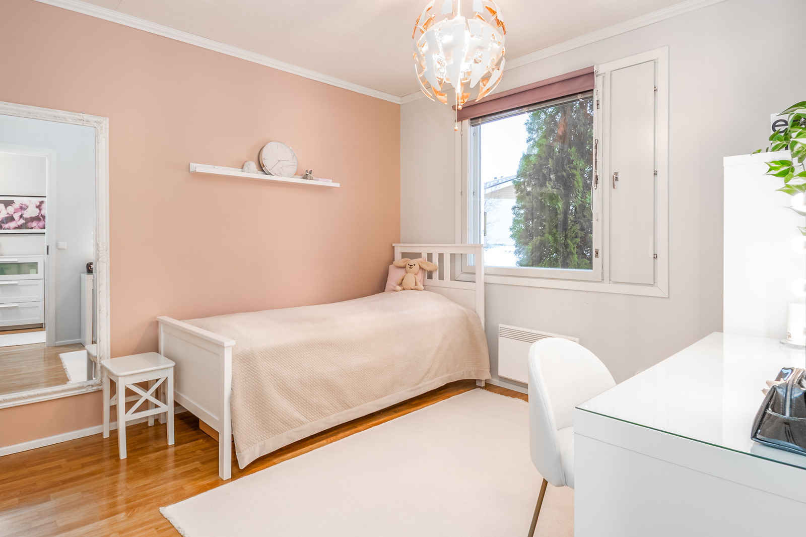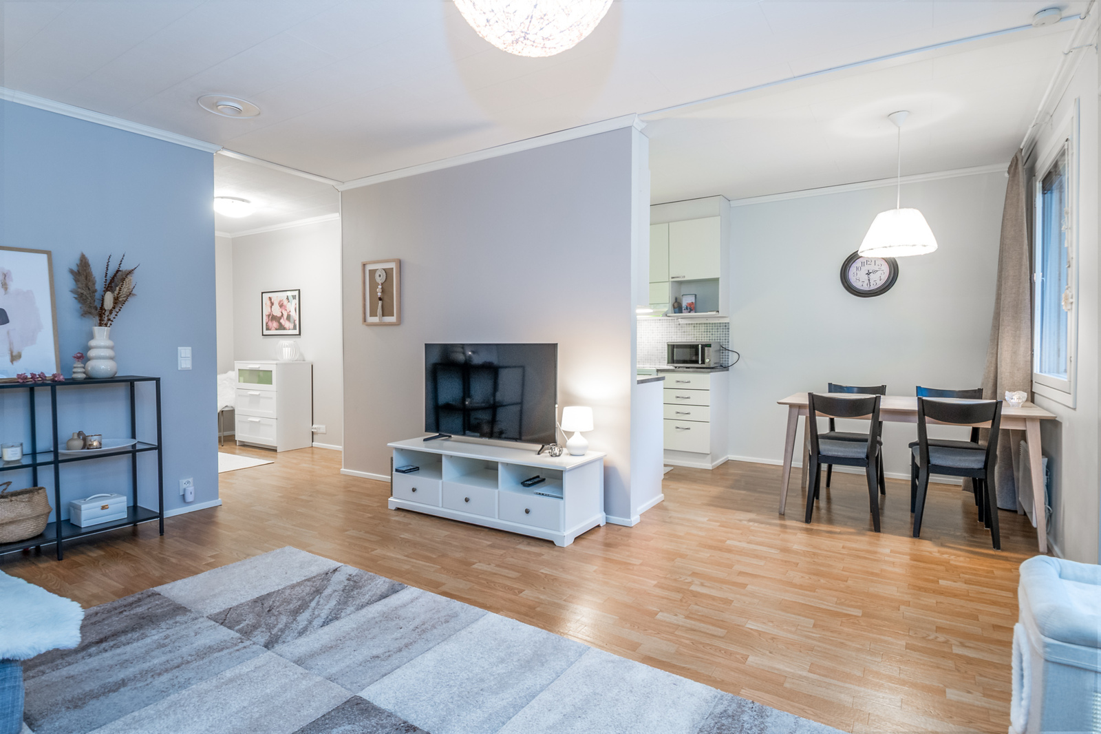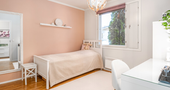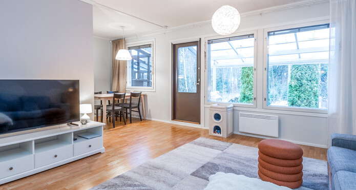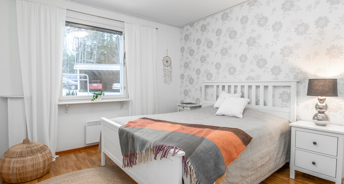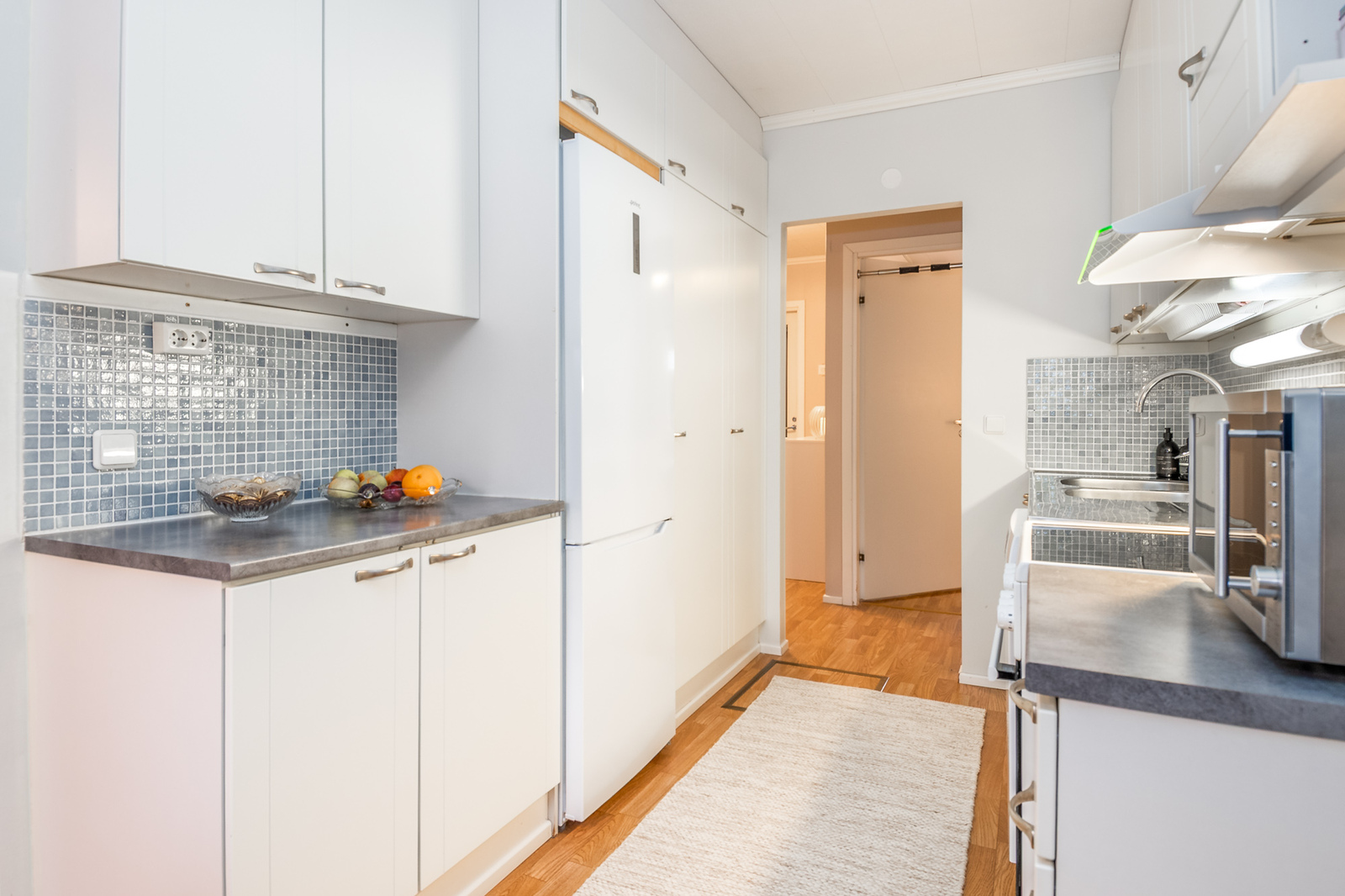 Tämä 80 asuinneliön koti on pohjaratkaisultaan erinomainen. Tilat ovat yhdessä kerroksessa ja jakautuvat tilavaan olohuoneeseen, osittain avoimeen keittiöön, kahteen hyvänkokoiseen makuuhuoneeseen ja juuri remontoituun kylpyhuoneeseen sekä omaan saunaan. Toisesta makuuhuoneesta löytyy myös vaatehuone.