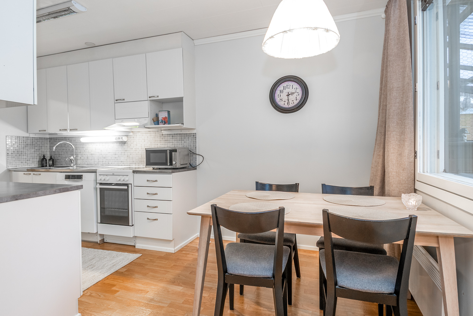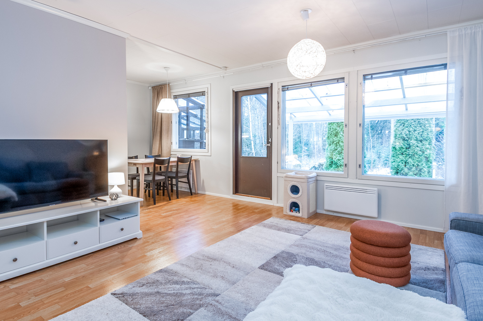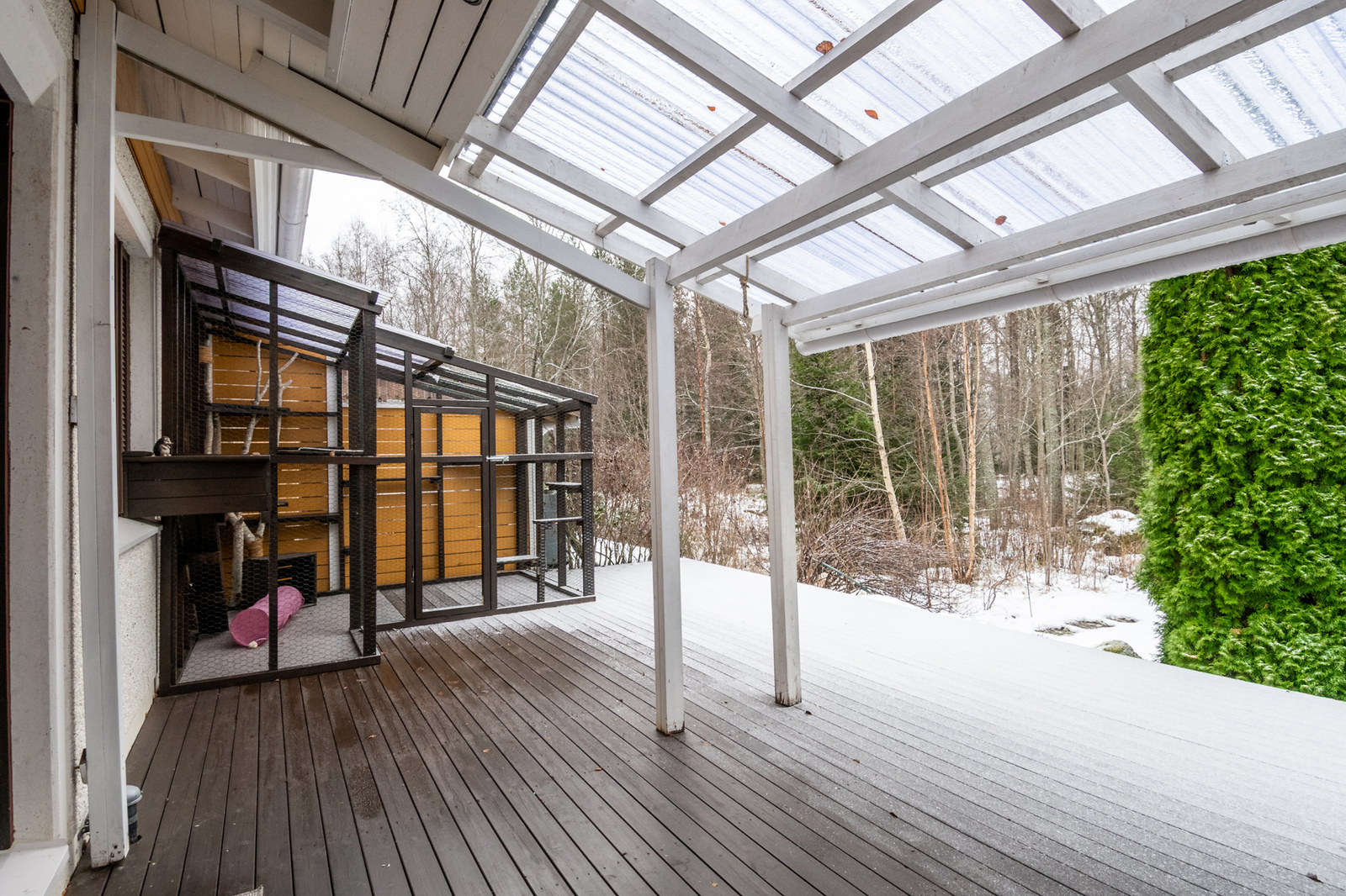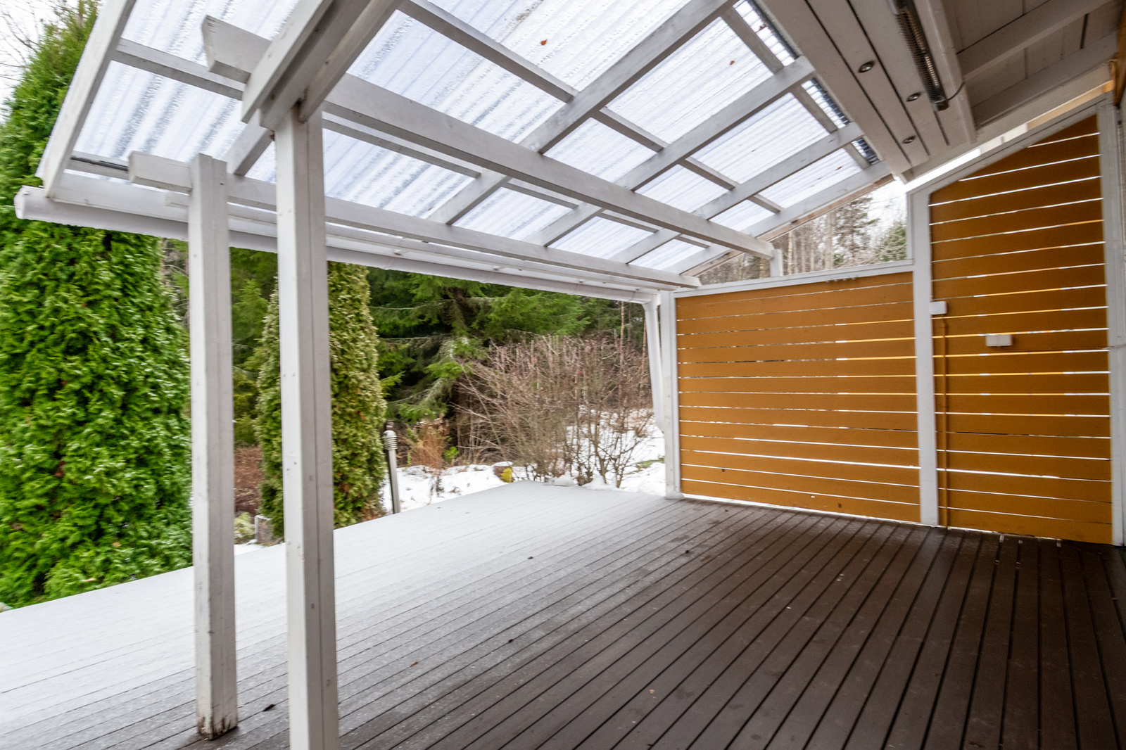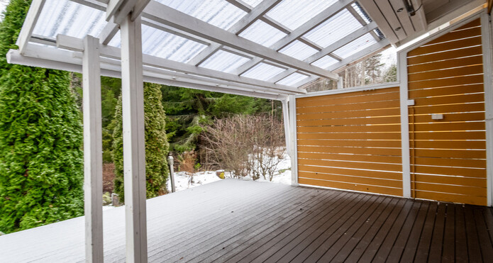 Erityisen houkuttelevan tästä asunnosta tekee kuitenkin takapiha sinne rakennettu upea terassikokonaisuus, jossa on niin katettua kuin kattamatonta alaa. Lisäksi näkymät viheralueen suuntaan ovat kesäaikaan todella vehreät ja suojaisat. Tällaisia rivitalon piha-alueita ei monesti tule vastaan!