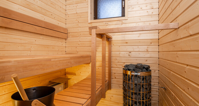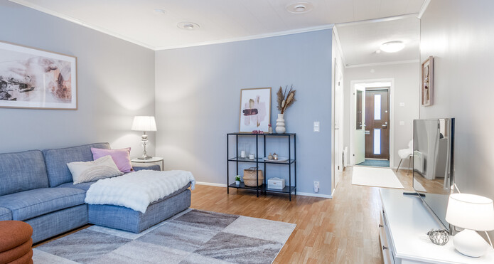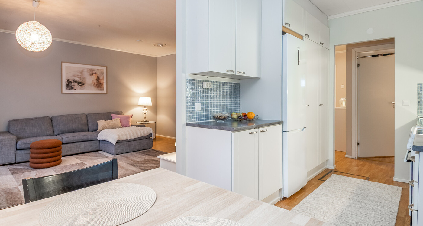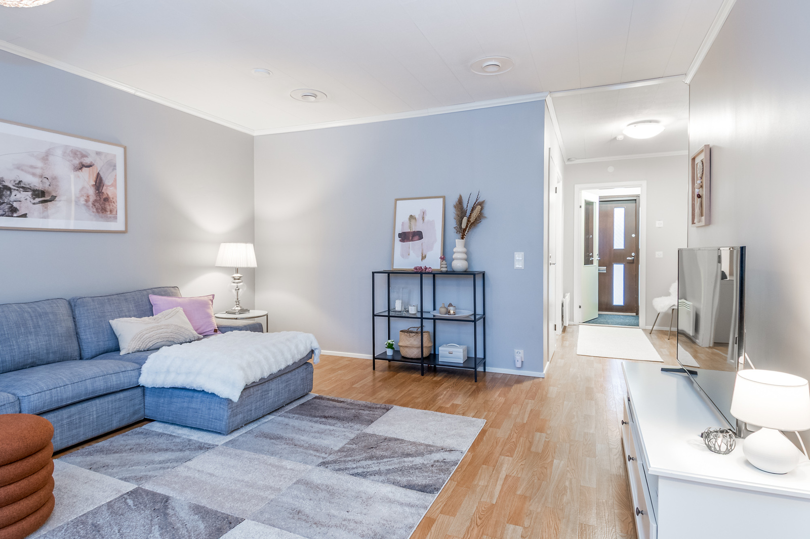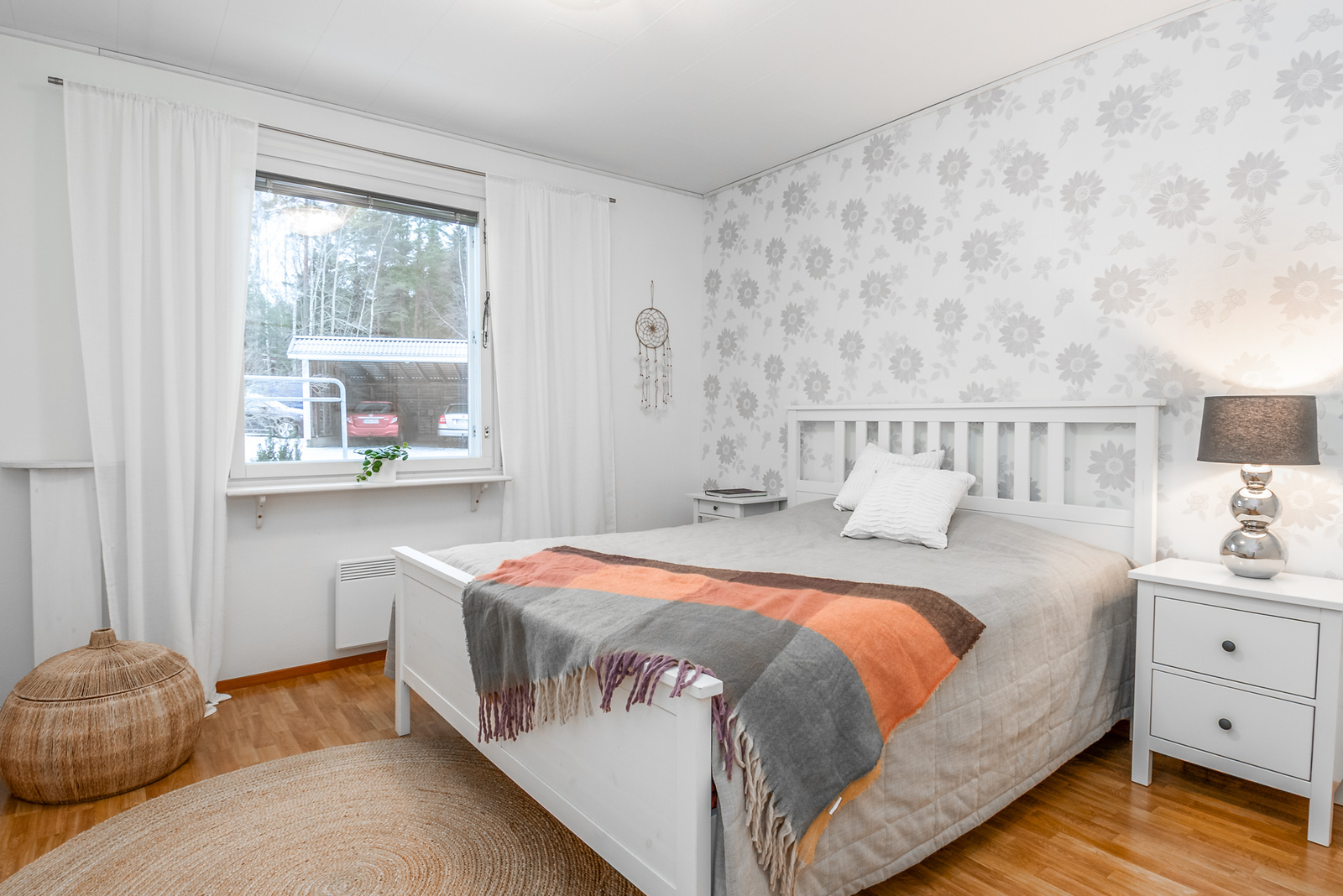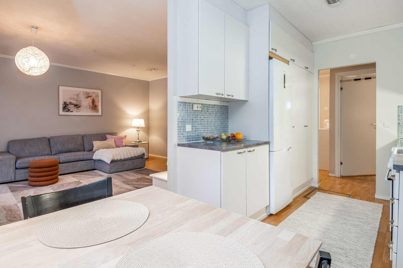 Detta hem på 80 m2 har en utmärkt planlösning. Utrymmena finns i ett enda plan och består av ett rymligt vardagsrum, ett delvis öppet kök, två sovrum i bra storlek samt ett renoverad badrum och egen bastu. I det ena sovrummet finns dessutom en garderob.