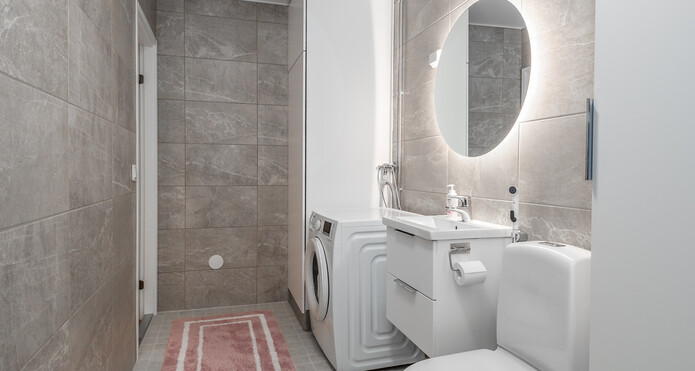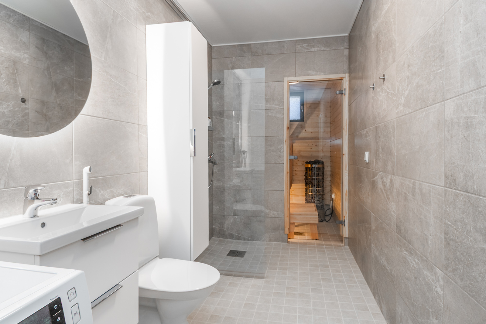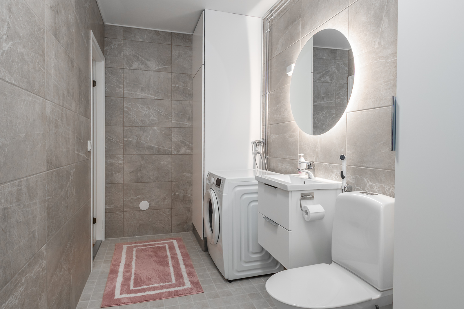 Varusteet: pesukoneliitäntä, lattialämmitys, suihku, peili