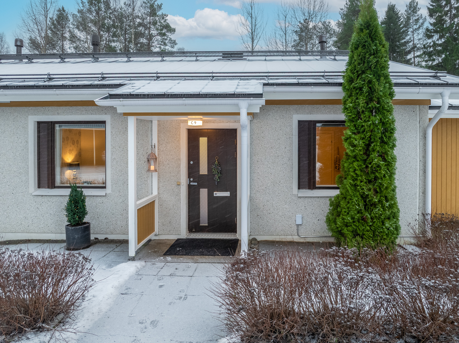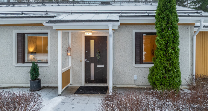 Det som gör denna bostad verkligt lockande är ändå bakgården. Här har byggts en fantastisk terrasshelhet där en del av terrassen har tak och en del är utan tak. Dessutom har man sommartid en verkligt grönskande och skyddad utsikt mot det närliggande grönområdet. Sådana här gårdsplaner är sällsynta i radhusområden!